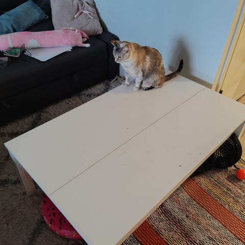 Tuolta näkeepi tarkat tiedot. Pöytä ehjä/toimiva. Pintapuoleisesti pölyt/kissankarvat pyyhitty mutta suurempi pesu jäänee ostajalle jos pesuraidat häirittee