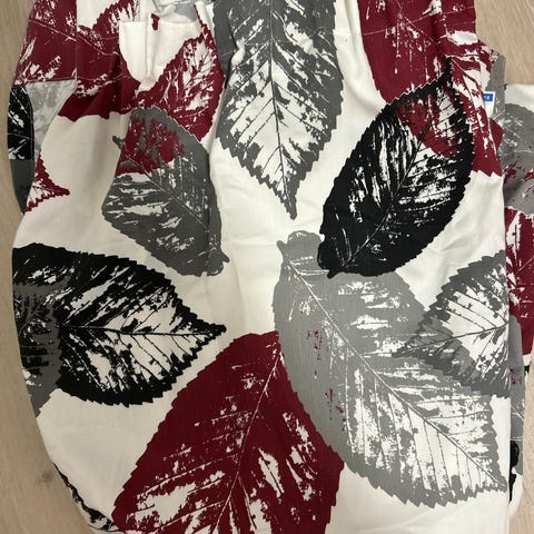 Kuvanmukaiset puukuvioiset verhot. Vaalenharmaa tausta jossa valkoisia ja ruskeita kuvioita. Korkeus n. 266 cm, leveys noin 132 cm