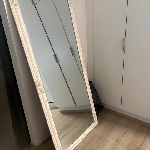 Jysk kokovartalopeili, jossa on valkoinen, koristeellinen kehys. Peili on lattiapeilityyppinen ja nojaa seinää vasten. Kehyksessä on yksityiskohtaisia koristekuvioita ylä- ja alareunassa sekä sivuilla. Sopii esimerkiksi eteiseen, makuuhuoneeseen tai vaatehuoneeseen pukeutumis- ja yleispeiliksi.