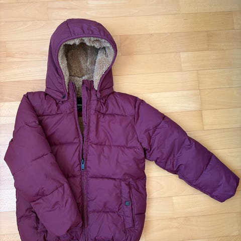 Everestin keltainen hupullinen toppatakki. Koko 110 mutta pieni mitoitus ja ennemmin mielestäni n. 104 cm kokoiselle. Ei ole pesty, tahraa löytyy edestä ja takaa.
