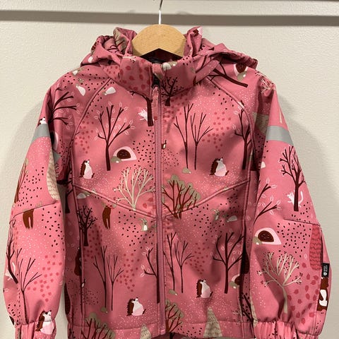 Everestin kevyt untuvatoppatakki, jossa softshell hihat. Välikauteen. Koko 98. Takana kauluksessa pieni viilto, huomioitu hinnasa.