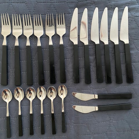 Kuvan mukaiset Bertel Gardbergin suunnittelemat aterimet ovat hyväkuntoisia, vähäisiä käytön jälkiä voi löytyä.