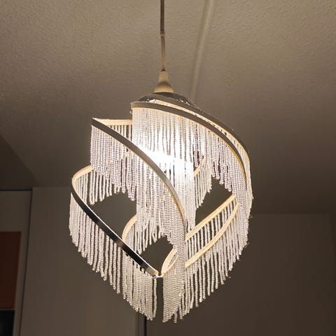 Toimiva kuparin värinen valaisin. Puuttuu johdon kiristin ruuvi.