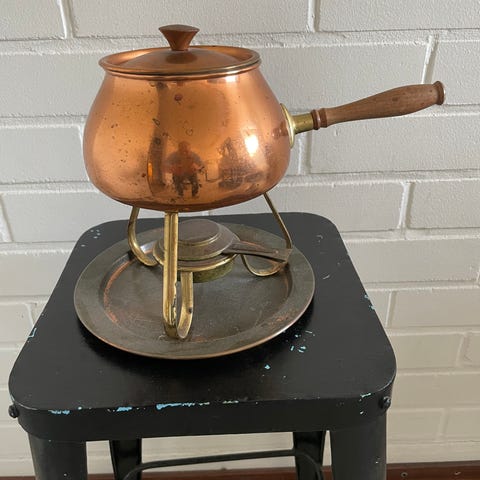 Heirol-fonduepata 6 henkilölle. Mattaemaloitu valurauta. Poltin johon menee polttonestettä, voin antaa pullon jämät kaupan päälle.