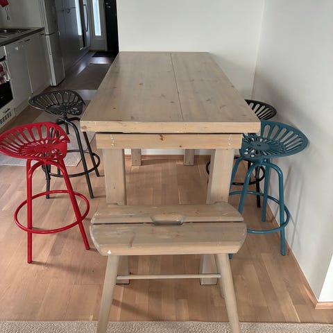 Seinään kiinnitettävä 95cm korkea musta pöytä. 2 baariatuolia, istuinkorkeus 65cm. Irroitettavat valkoiset kangaspäällysteet, käytön jälkiä on. Lisäksi mukaan saa beiget kangaspäällysteet (mielestäni hieman isoa kokoa). Saa ostettua myös pelkät tuolit. Vain nouto.