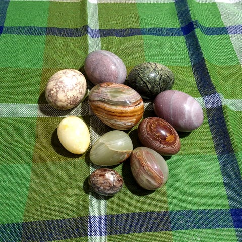 Munat on valmistettu erilaisista luonnonkivistä, kuten akaatti, alabasteri ja muut. 6 kplx15€+1 kauppanpäälle.