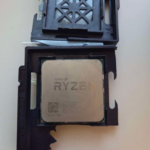 AMD Ryzen 5 1600 prosessori joka sopii AM4-kantaan. Kuvissa mukana myös AMD:n vakiojäähdytin tuulettimineen. Soveltuu hyvin yleiskäyttöön ja kevyeen pelaamiseen.