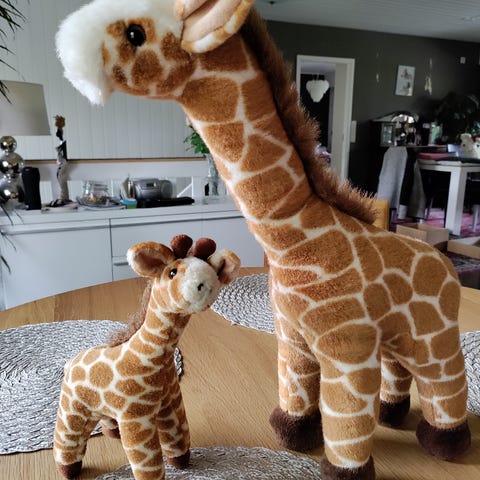 Tämä Nici-merkkinen, eläinaiheinen avaimenperä on 2000-luvun alkupuolen tuotantoa. Kirahvi on selvästi elämää nähnyt ja kokenut, osa langoista hapsottaa ja on myös paikoitellen vähän likainen, ei ole kuitenkaan rikki. Rapulukko on toimiva. Voisi hyötyä hellästä pesusta (haalistuneessa lapussa merkitty pesu 30 asteessa).