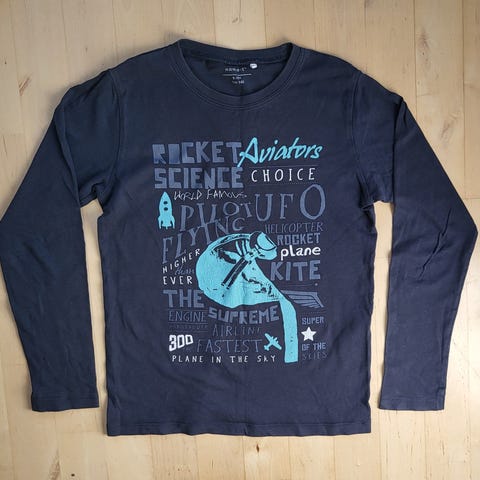 Name Itin musta ribbipaita. Koko 134/140, vastaa minusta paremmin 128/134. Kapeahko mutta erittäin joustava materiaali. Kunto on hyvä: ehjä, tahraton, nypytön, pehmeä. Hiukan vain uudesta haalistunut. Materiaalit puuvilla, modaali (viskoelastaani) ja elastaani.