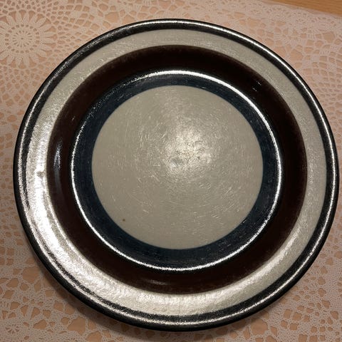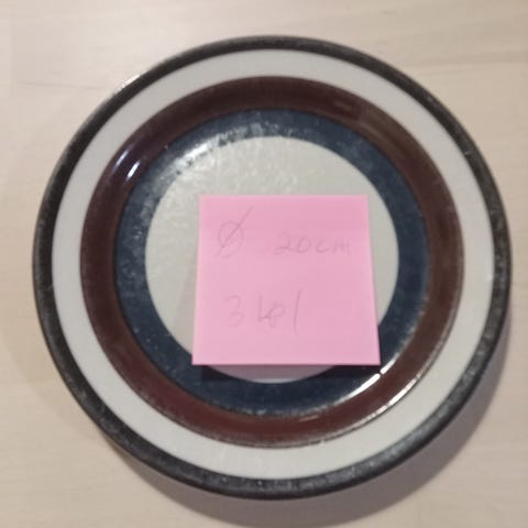 Arabia Kaira lautanen. Lautasessa on ruskea, sininen ja valkoinen rengaskuviointi. Materiaalina on lasitettu keramiikka/posliini. Sopii esimerkiksi kattaukseen ruokalautasena tai tarjoiluun osana Kaira-sarjaa.