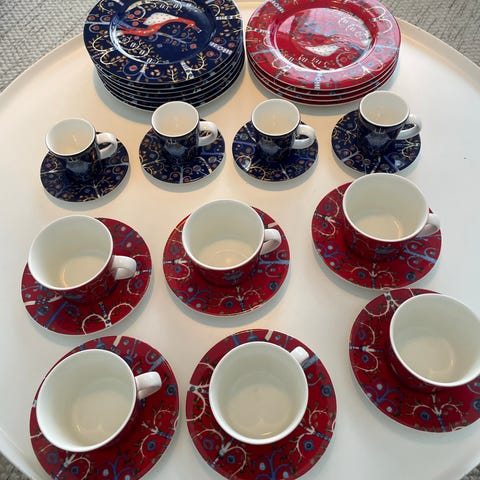 Iittala Taika astiasetti. Kaksi jokaista astiaa. Sininen kahvikuppi hieman tummunut sisältä. Hintapyynti koko setistä 100€.