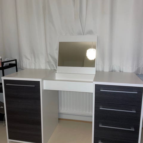 Myydään hyväkuntoinen Jyskin työpöytä, joka ollut itsellä käytössä meikkipöytänä. Ei kulumajälkiä. Mitat tiedoissa. Vain nouto, pöytä on kevyt.