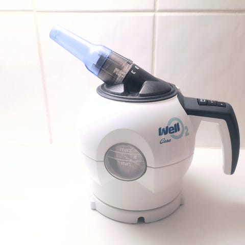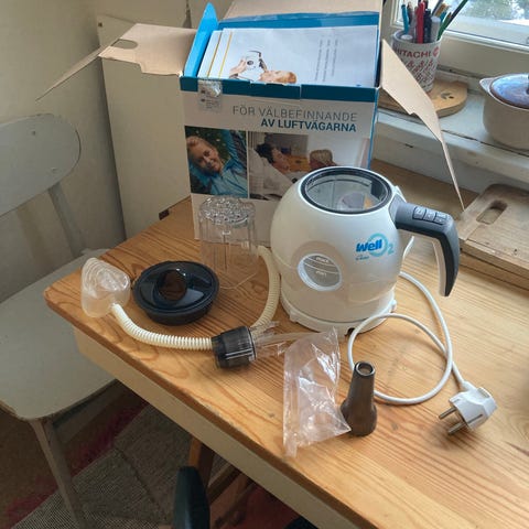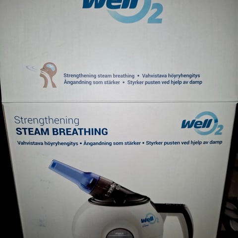 Hyväkuntoinen ja vähälle käytölle jäänyt hengitysharjoituslaite. Wello2 on tarkoitettu hengityslihasten vahvistamiseen. Lämmin höyry kosteuttaa hengitysteitä.