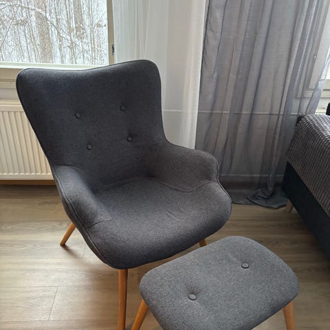 Myydään nojatuoli ja rahi. Väri tummanharmaa. Uudenveroinen.