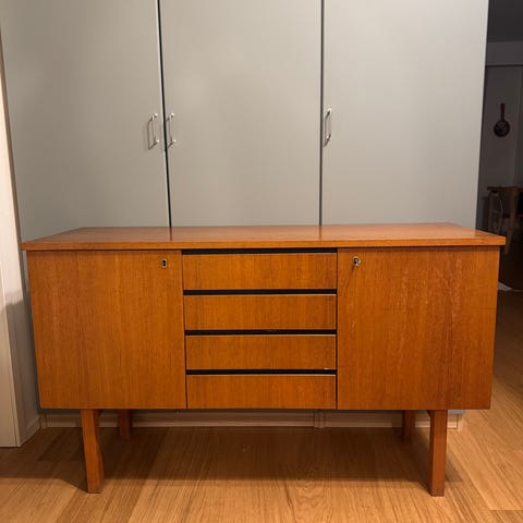 Teak tiikki senkki tv taso sisustus vintage huonekalu säilytys kaappi lipasto hylly