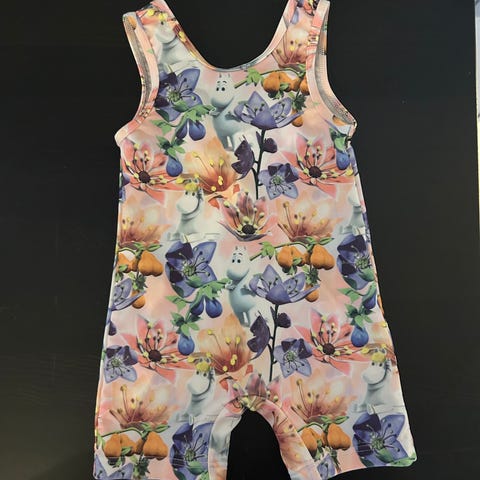 Hyväkuntoinen lahkeellinen muumi uimapuku. Kokomerkintä 86/92, mutta vastaa enemmän kokoa 86.