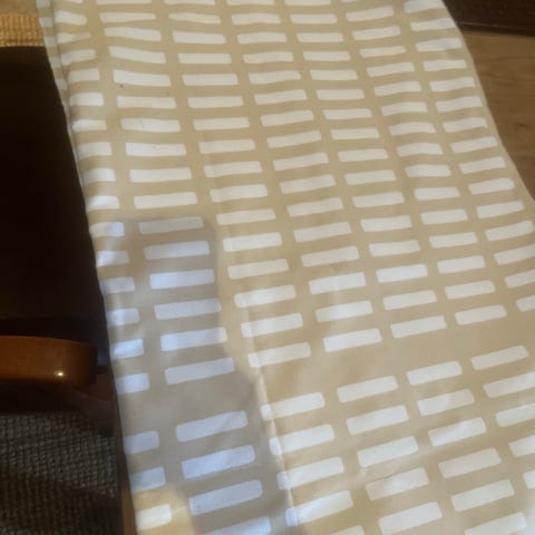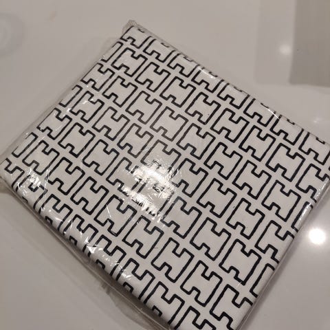 Artekista ostettu sienna kangas vielä paketissa. Koko 300cm * 145cm. Näitä mustavalkoisia paketteja on 3 ja sinivalkoisia 1, eivät koskaan päätyneetkään meille verhoiksi. Yhden paketin hinta 70€, kaikki neljä saa 250€.