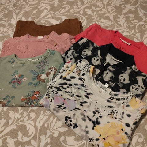 Siistit käytetyt. Osa vain käyttöönotto pesty. Paketissa kaksi collegepaitaa, yksi collegemekko (kokoa 92 mutta reilua kokoa), yksi karvatakki ja yksi ohuempi pitkähihainen paita. Ei lemmikkejä taloudessa. Mmm.
