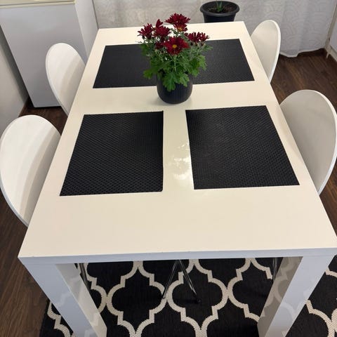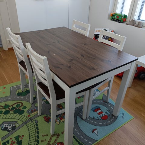 Pähkinänvärinen puinen 6-hengen ruokailuryhmä. Pitkään ollut käytössä, joten käytönjälkiä on. Ikäisekseen kunto hyvä.