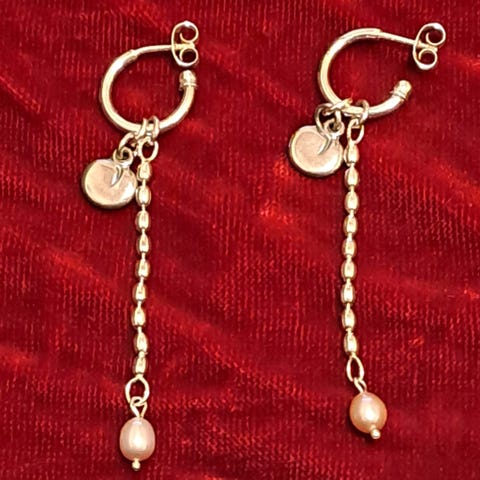 Hopeiset roikkuvat Vanamo-korvikset, vaaleanpunaisella makeanveden helmellä.