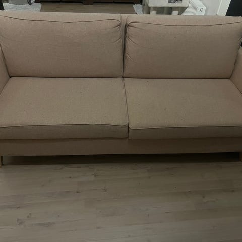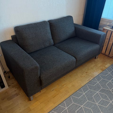 Myynnissä muuton tieltä Harmaa kahden istuttava sohva, jossa suorat käsinojat ja irrotettavat selkätyynyt. Sohvassa on kangasverhoilu ja kapeat jalat.