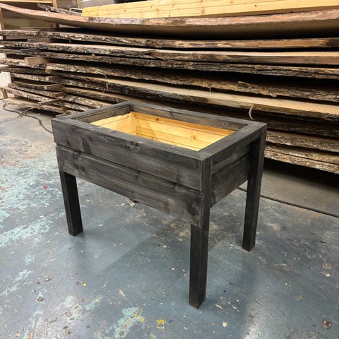 Käsityönä tehty puinen musta istutuslaatikko jaloilla