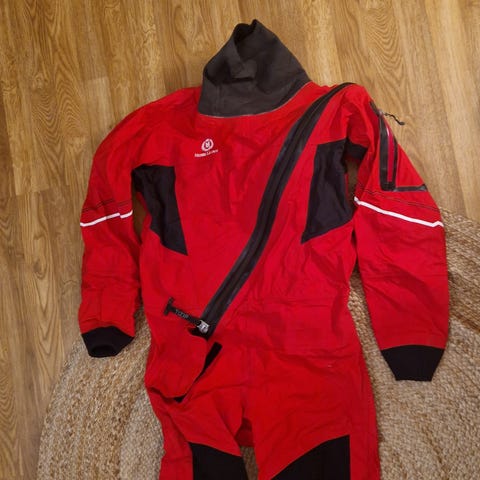Hihansuissa on tiiviit mansetit, jotka auttavat pitämään veden ulkopuolella. Kaulan mansettia leikattu. Muuten todella hyvässä kunossa.