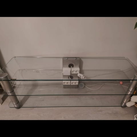 Kuvan mukainen tv-taso. Ei naarmuja. Mustat osat metallia ja levyt laminaattia. Kuvassa 58 tuumainen telkkari mahtuu hyvin isommallakin jalalla