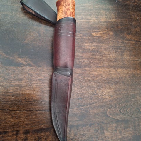 Puukko. Tunturiloma Oy, Rovaniemi. Puukossa myös (tekijän?) signeeraus: Nattanen (jos oikein tulkitsin). Joskus kaiketi käytössä ollut, kun puukon päässä jotain jälkiä, samoin nahkaisessa tupessa. En osaa sanoa, että kaipaako puukko teroitusta vai ei. Omasta mielestäni hyväkuntoinen.