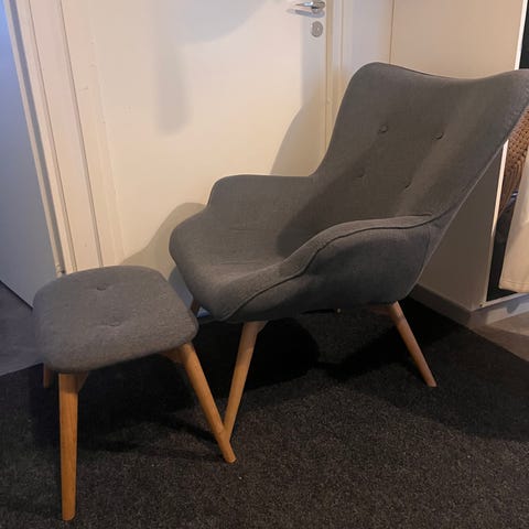 Hyväkuntoinen nojatuoli ja rahi.Tarkempia tietoja https://www.ikea.com/fi/fi/p/strandmon-nojatuoli-nordvalla-tummanharmaa-20343224/?gad_source=1&gad_campaignid=19921008690&gclid=CjwKCAiA-sXMBhAOEiwAGGw6LAvBA4T1P17R9y8mVHC3B2EV9GWbuY87_GgUlWBVZtNE8qMUCJJCuBoCvbYQAvD_BwE