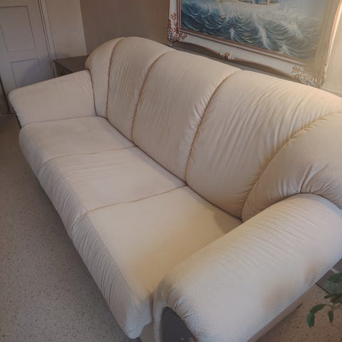 Annetaan vihertävän harmaa sohvaryhmä. Pehmeää sametin tuntuista materiaalia. Sohva on ok kunnossa, nojatuolit vaativat pesua. Sohvan pituus 185 cm.