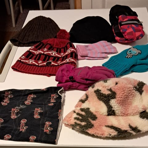 tytön käsine, sukka ja hattusetti kaikki kuvassa olevat 10 €