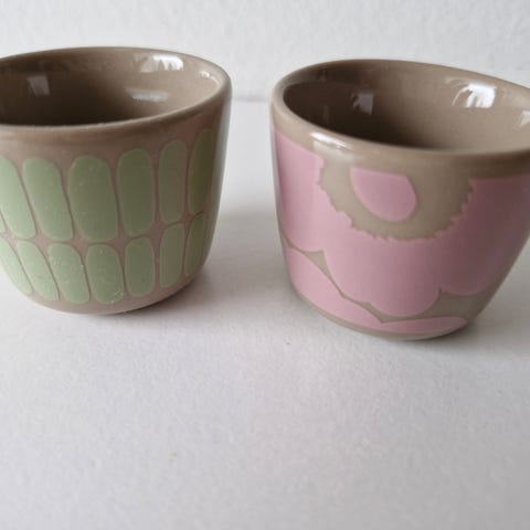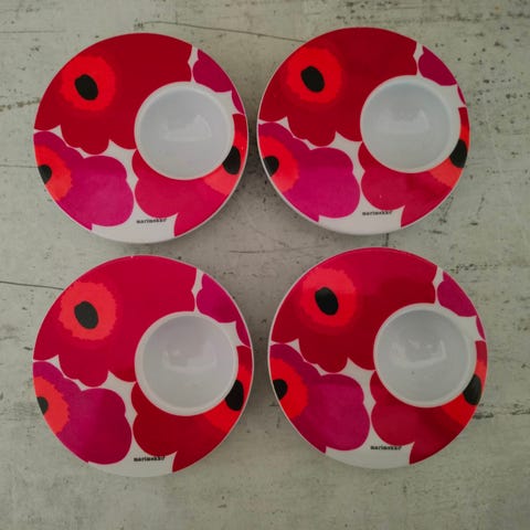 Kaksi Marimekon munakuppia ja kaksi lusikkaa
