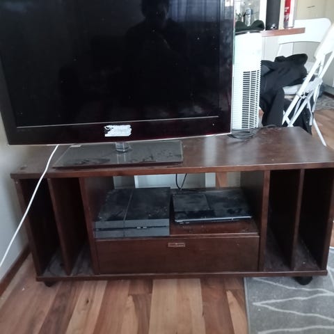 Metallijaloilla, kansi afrikkalaista puuta, kaksi vetolaatikkoa, käytössä pari vuotta. Mitat: k 45, l 41 p 140.