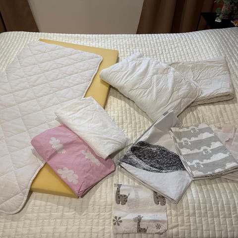 1 isompi aluslakana (valkoinen) ja mukaan saa 3 aluslakanaa jotka oli selkeästi pienempiä että ihan en satavarma ole passaako joka pinnasänkyyn.