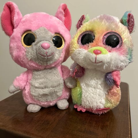 Ty pehmoavaimenperät koira ja pingviini. Molemmissa on pehmeä plyysipinta ja suuret muoviset silmät. Yläosassa on metallinen klipsikiinnitys, jonka avulla avaimenperät voi kiinnittää esimerkiksi reppuun, laukkuun tai avaimiin. Sopivat lasten leikkeihin tai koristeeksi. Korkeus n. 9cm.