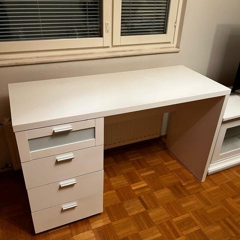 Söpö kirjoituspöytä, joka vaatii hieman kunnostusta. Kirjoitustaso osittain irti ja pinta kulunut. Käsistään kätevä henkilö saisi tästä pienellä työllä persoonallisen huonekalun.