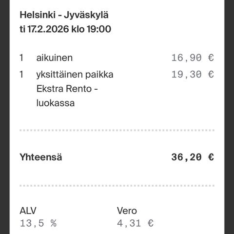 Lauantai 21.2.2026 Turku - Helsinki junalippu
