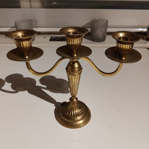 Myydään kaunis ja painava messinkinen 5-haarainen kynttilänjalka. Klassinen ja ajaton malli, sopii hienosti esimerkiksi ruokapöydälle, lipaston päälle tai juhlakattaukseen.