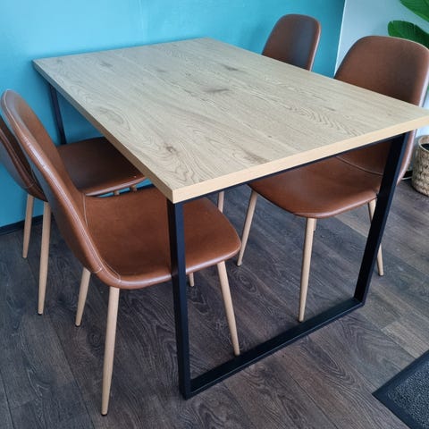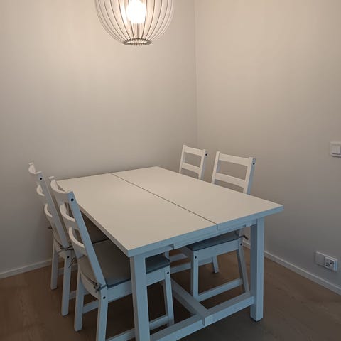 Jysk tammilankkupöytä, jonka mukana 6 kpl mustia tuoleja. Pöydän koko 100x225 cm. Ollut lapsiperheille 6 vuotta, joten jonkin verran käytön jälkiä löytyy.