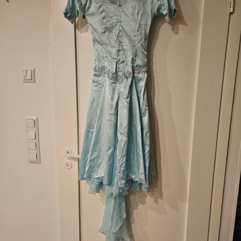 Koko S, puvun mallin puolesta kaventaminen onnistuu. Mekkoon kuuluu kaulakoru sekä kaksi rannekorua.