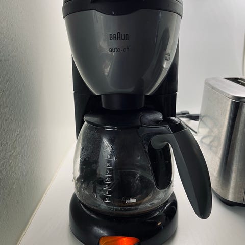 Braun kahvinkeitin, väri musta. Laitteessa irrotettava suodatinpidike ja vesimäärän mitta-asteikko sivussa. Mukana lasikannu, joka asettuu keittimen alaosaan lämpölevylle. Nyt jo valmiiksi pakattuna. Toimii hyvin, jäänyt vähälle käytölle.