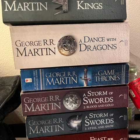 George R.R. Martinin A Song of Ice and Fire -kirjasarja, pokkaripainokset englanniksi. Mukana viisi osaa: A Game of Thrones, A Clash of Kings, A Storm of Swords, A Feast for Crows ja A Dance with Dragons. Kirjat ovat pehmeäkantisia ja englanninkielisiä fantasiaromaaneja.