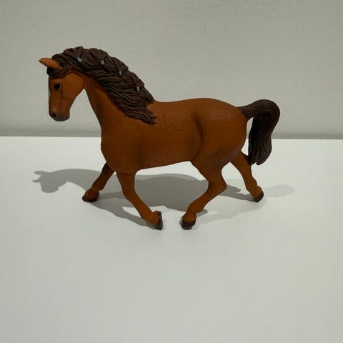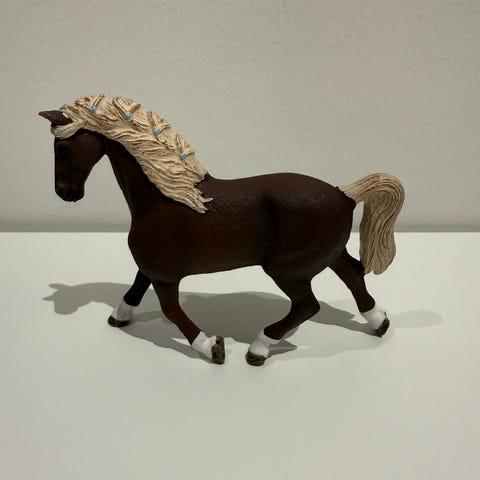 Schleich hevosfiguuri. Ruskea hevonen, jossa musta harja ja häntä sekä valkoisia merkkejä jaloissa ja päässä. Muovinen eläinfiguuri sopii leikkeihin ja kokoelmiin.