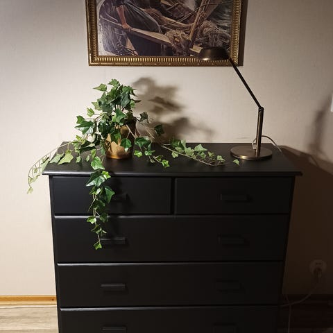 Lipasto, jossa on neljä laatikkoa. Kaksi pienempää laatikkoa ylhäällä ja kaksi leveää laatikkoa alhaalla. Materiaalina puu, pinnassa kuviollinen ruskea puuviilu. Vetiminä pienet nupit jokaisessa laatikossa. Soveltuu esimerkiksi vaatteiden, liinavaatteiden tai pientavaroiden säilytykseen makuuhuoneessa, olohuoneessa tai eteisessä.