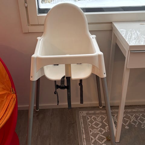 IKEA syöttötuoli lapsille. Puinen, musta syöttötuoli, jossa turvavyöt ja jalkatuki.