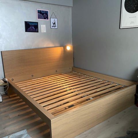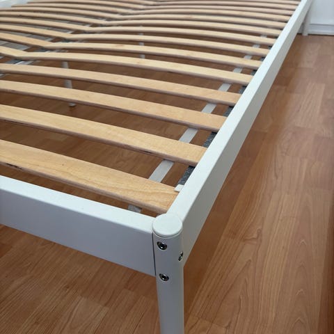 Hyvä kunto, ainoa miinus on jalkopäässä näkyvät valkoiset jäljet joita ei saa pesemällä pois. Alkuperäisestä poiketen nupit maalattu kultaiseksi spraymaalilla. Ainakin yhdessä nupissa hieman kulumaa, muut siistejä. Ei sisällä sälepohjaa, itse ollaan pidetty runkopatjaa rungon päällä.