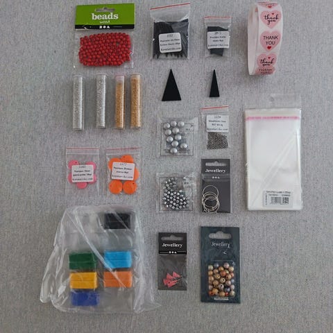 korupiikit, hopeanvärinen koruketju, eriväriset kukat esim. korvakorutappeihin, vihreät siemenhelmet ja muut vihreät helmet, esim. kukkahelmi, sydänhelmi,
