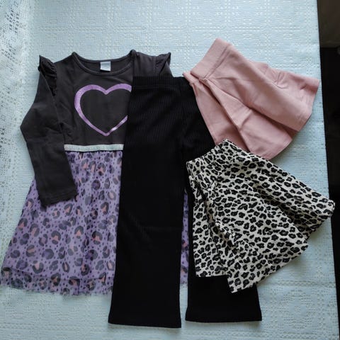 Muut kolme mekkoa itsetehtyjä. Olleet käytössä koot 98-110 cm (josta 110 cm ovat olleet ennemmin tunikakäytössä kuin mekkoina).