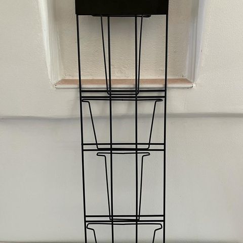 Myydään persoonallinen avain-/korttiteline, lev. 33,5 cm, kork. 67 cm. Teline on ostettu käsityömessuilta, ja se on alunperin tarkoitettu korteille ja muistilapuille. Telineen taustalla on metallinen verkko, johon voi kätevästi kiinnittää pyykkipoikia.